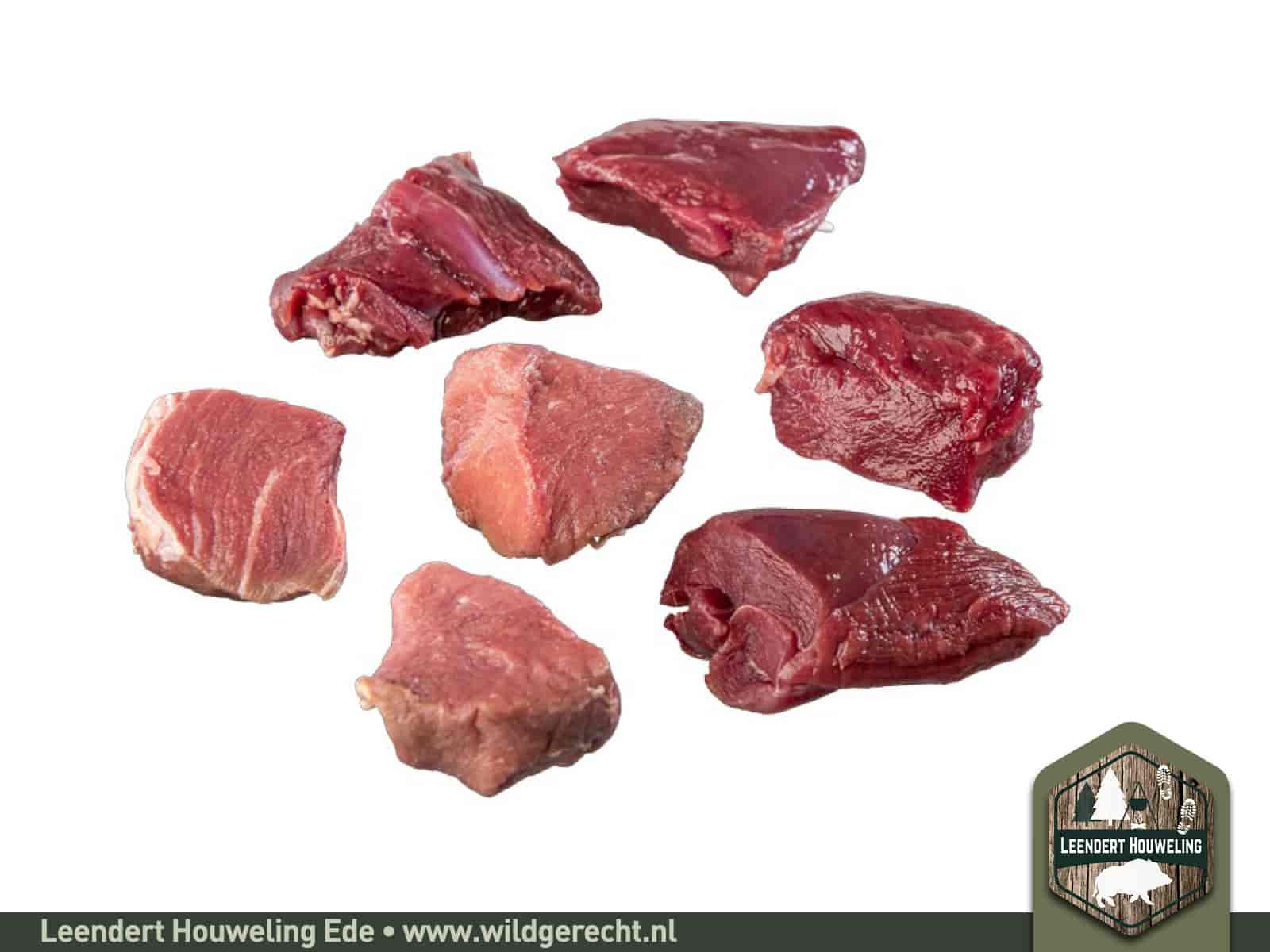 Blokjes vlees van hert, zwijn en ree. Bijvoorbeeld voor het maken van een heerlijke stoof.